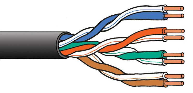 CAT5e UTP кабель, сечение 0.22 мм² (24 AWG), жила 7 х 0.2 мм, чистая OFC медь, изоляция полиолефин, без экрана, Ø-6.35 мм, оболочка PVC.