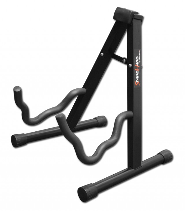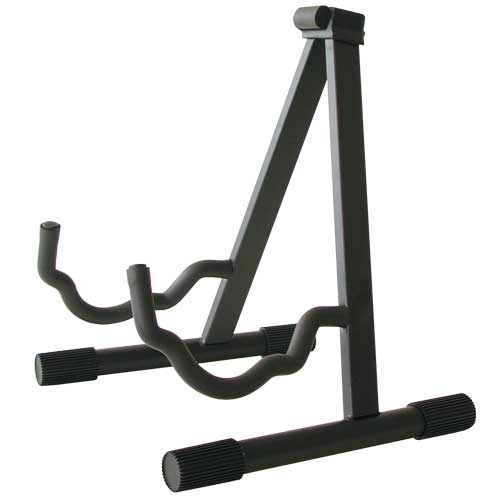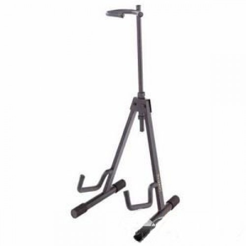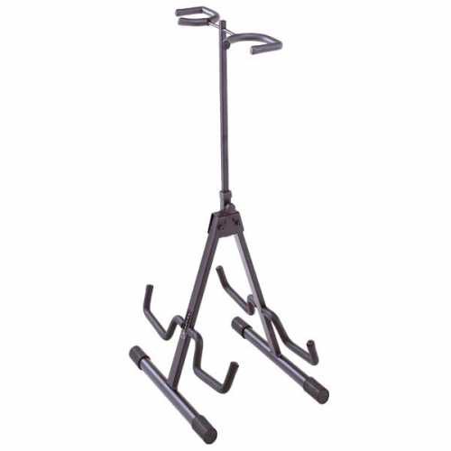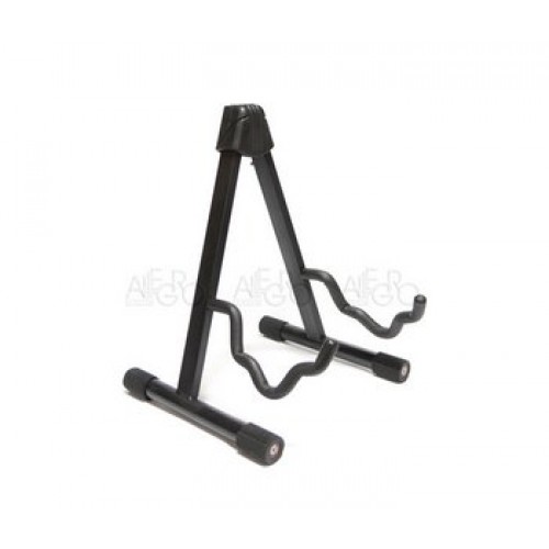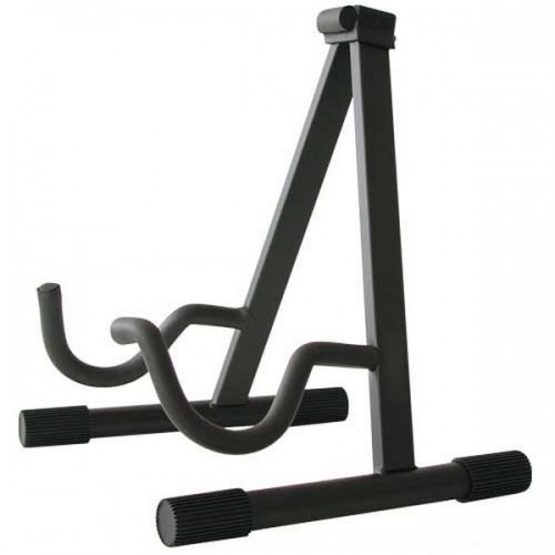 Стойка А-образной формы для электро- или акустической гитары, высота 37 см, опоры покрыты натуральным каучуком, подставка оборудована фиксатором, ширина 30 см, вес: 1,4 кг, цвет: черный.