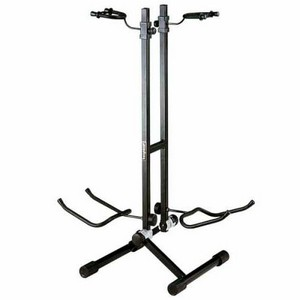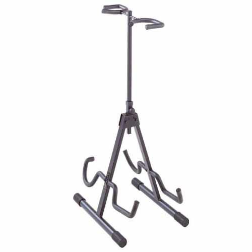 Двойная гитарная стойка с подставками под грифы, регулируемая по высоте 53 – 83 см, опоры покрыты натуральным каучуком, подставка под гриф оборудована фиксатором, ширина 30 см, вес: 3 кг.