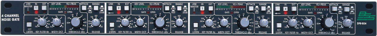 На передней панели установлены индикатор уровня сигнала относительно порога срабатывания (с пик-индикацией) и индикатор состояния прибора (открыт/закрыт). DPR-504 имеет симметричные входы и выходы на стандартных разъемах XLR.