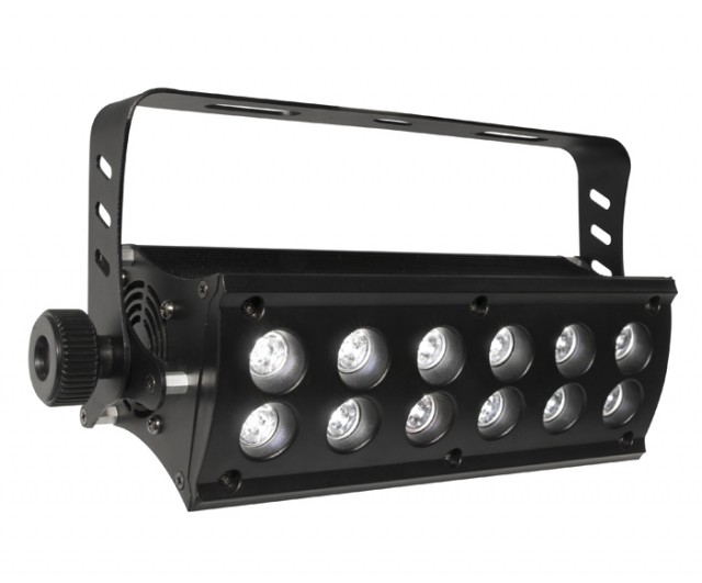 Стробоскоп, 2,5,8 каналов DMX-512, 12 мощных светодиодов (3 Вт, 700мА), эффект стробирования 0-26 Гц, угол раскрытия луча 20°, покрытие 38°, освещенность: 2186 lux на 2 м., каскадирование до 48 устройств.