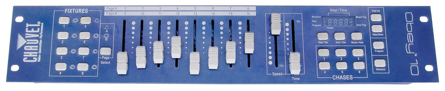 Chauvet Obey™ 10 - может сохранить 6 наборов чейсов (chases), содержащие до 999 сцен каждый. Удобство использования и гибкость были ключевыми моментами при разработке этого устройства, поэтому CHAUVET® добавили способность реверса слайдеров и функцию переназначения каналов. Также немаловажной функцией является возможность подхвата управления приборами "на лету", и переключение их между звуковой активацией и автоматическими программами без вмешательства оператора.