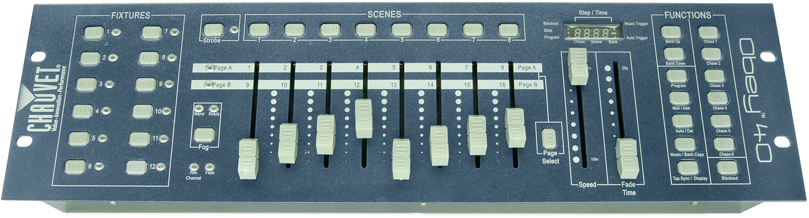 Chauvet Obey™ 40 - является следующим шагом по сравнению с Obey 10, что позволяет контролировать до 12 световых приборов на 16 каналов каждый. С немного большим размером вы получаете больший функционал: Obey 40 имеет 30 банков по 8 сцен, или до 240 сцен. Obey 40 обеспечивает гибкость своего младшего брата, но также добавляет контроль для дым машин и стробоскопов, плюс MIDI совместимость.