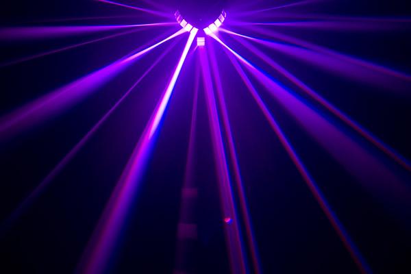 LED эффект стреляющий пучками лучей, 3-канальный DMX-512, 2 мощных 7 Вт трехцветных диода, управление RGB диодами, управление скоростью мотора, статические цвета, встроенные авто. программы, звуковая активация, покрытие 155°.