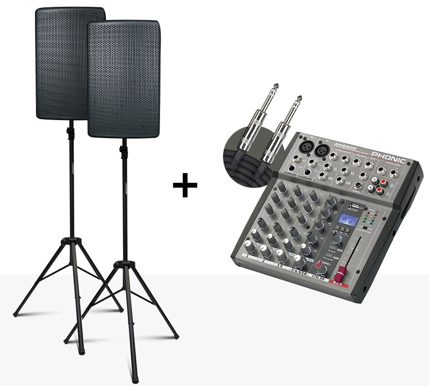 Комплект звукоусиления состоит из: активной АС Clarity MAX12HD (2 шт), кабели Mogami СJ-3 и СJ-6, стойки Clarity BT-ES50 (2 шт), микшерного пульта Phonic AM 220P.