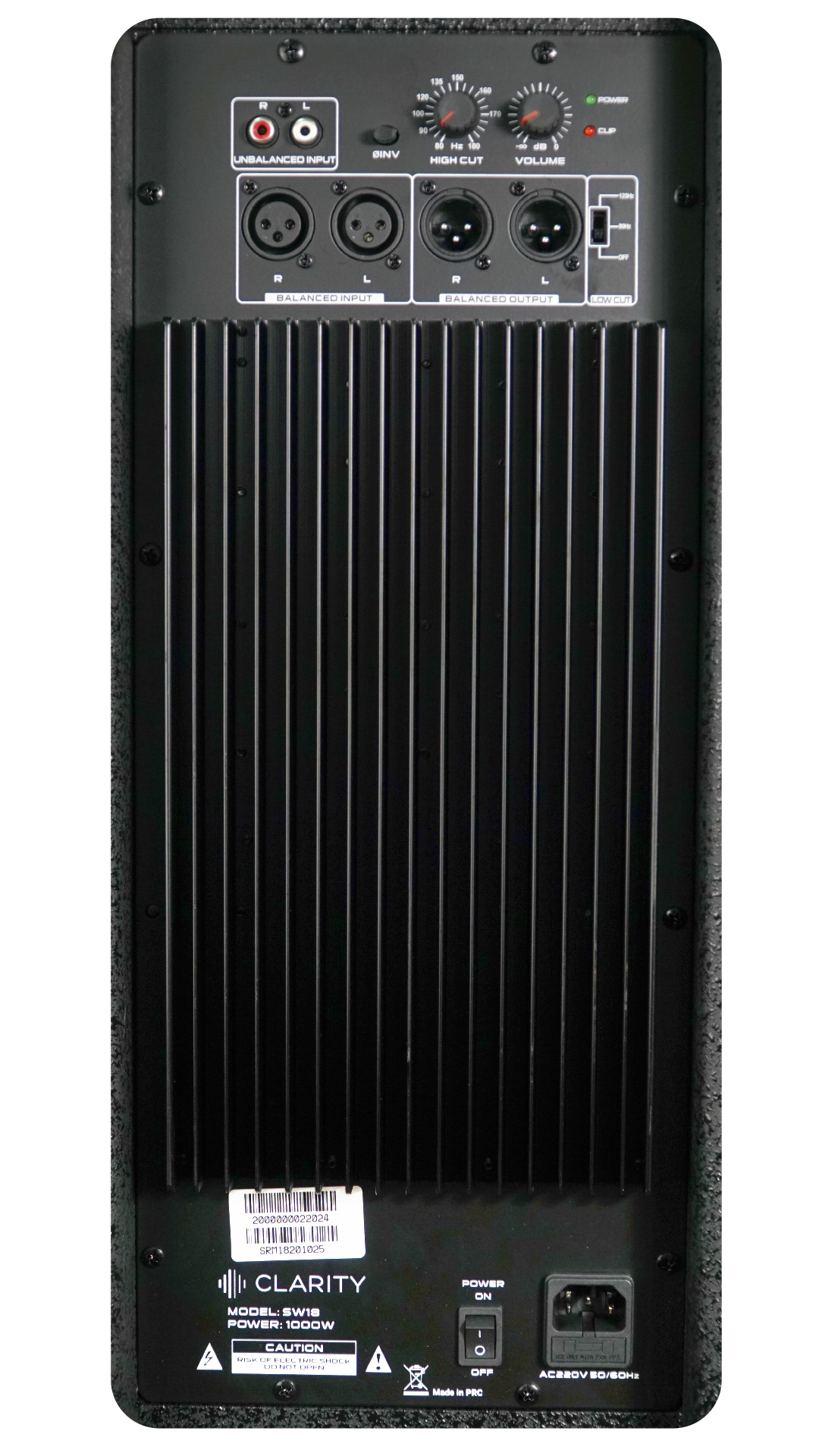 Активный сабвуфер, усилитель класса D, мощностью 1000 Вт (Пик), 18" динамик, АЧХ 35-150 Гц, чувств-сть 125 дБ, 2x XLR/TRS входы, 2x XLR выхода, регулировка кроссовера сабтоп, 35 мм стакан, корпус - фанера, габариты: 535х600х650 мм, масса 51 кг.
