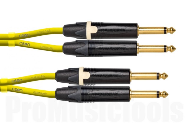 Готовый несимметричный двойной кабель 2х 6.3 мм TS Jack/2х 6.3 мм TS Jack для коммутации DJ оборудования, спиральный экран, коннекторы Neutrik NP2X-B, длина 3 м, цвет: желтый.