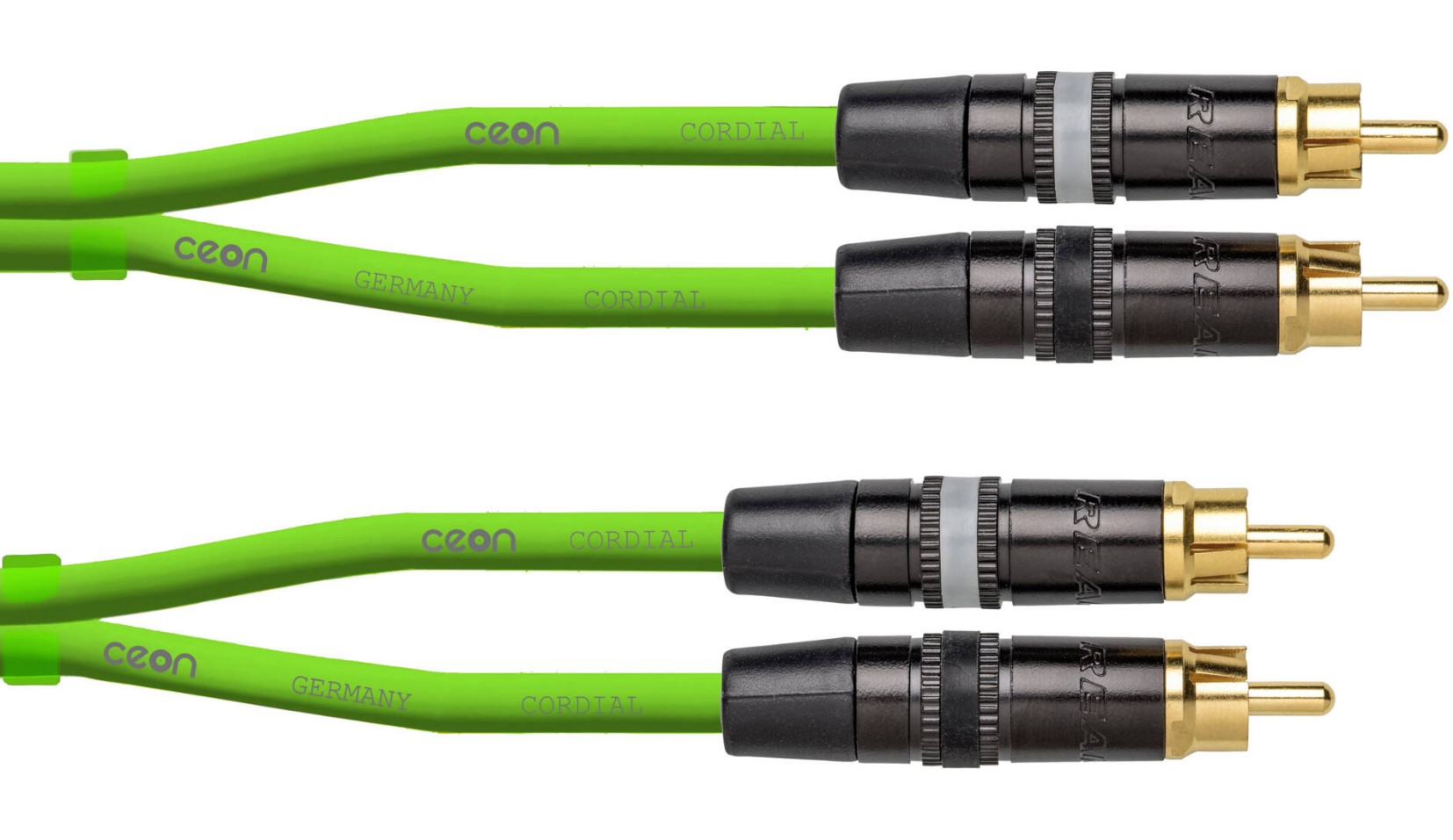 Готовый несимметричный двойной кабель 2х RCA Male/2х RCA Male для коммутации DJ оборудования, спиральный экран, коннекторы Neutrik REAN NYS 373, длина 3 м, цвет: зеленый.