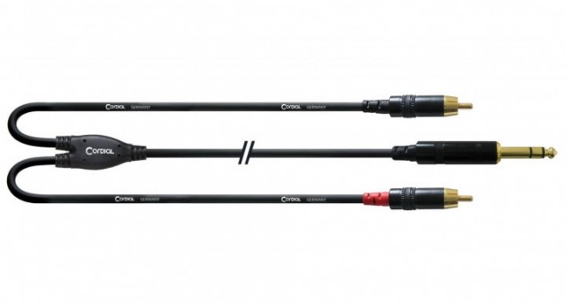Готовый несимметричный кабель разветвитель 6.3 мм TRS папа - 2x RCA папа, коннекторы Rean, сечение 0.22 мм², жила 28x0.10 мм, сопротивление 80 Ом/км, емкость 80 пФ/м, диаметр 5.9 мм, длина 6 метров, цвет: черный.