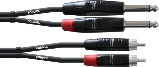 Готовый несимметричный двойной кабель 2х 6.3 мм TS Jack /2хRCA, коннекторы Rean, длина 3 м, цвет: черный.