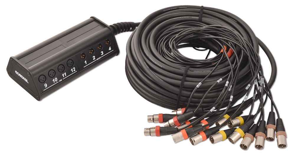 Мультикорный стейджбокс c раздельным экранированием, 12 XLR-F входов/4 XLR-M выходов, основа Cordial, коннекторы REAN®, цветовая маркировка каналов, длина 30 м./разделение линий по 40 см.