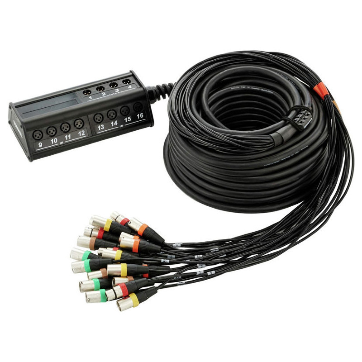 Мультикорный стейджбокс c раздельным экранированием, 16 XLR-F входов/4 XLR-M выходов, основа Cordial, коннекторы REAN®, цветовая маркировка каналов, длина 30 м./разделение линий по 40 см.