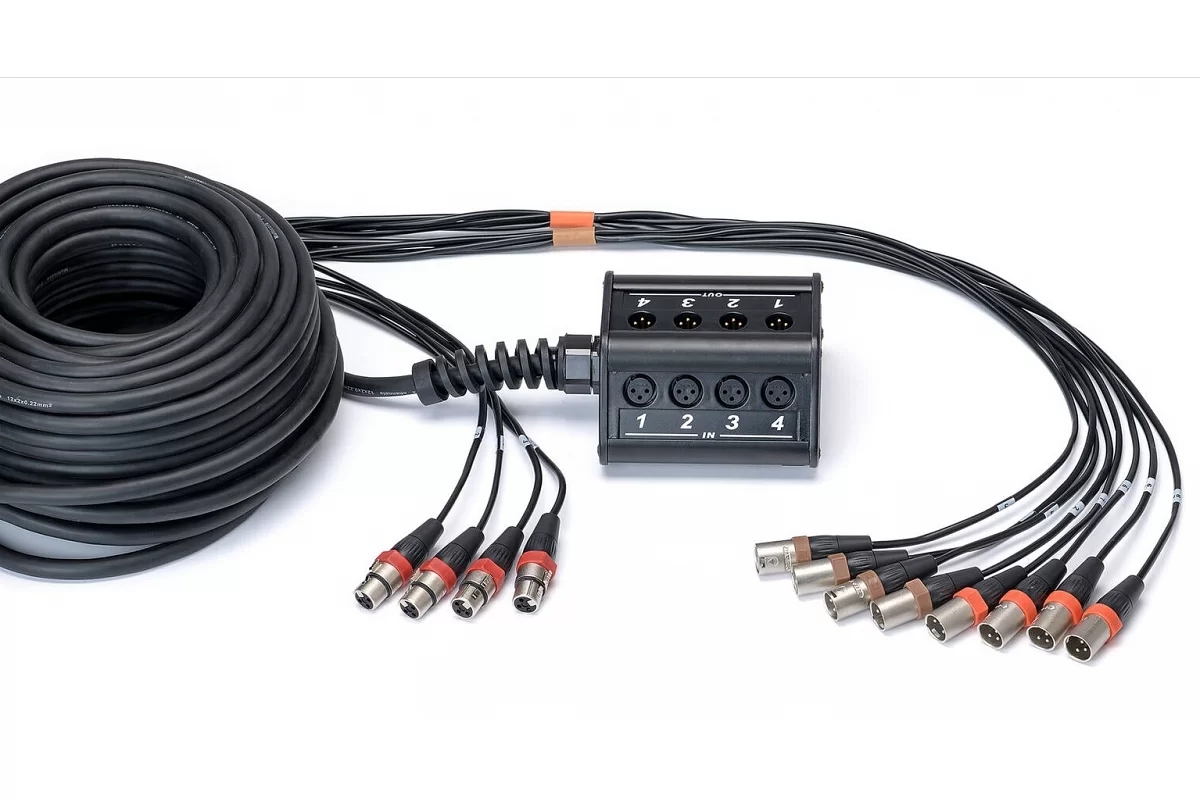 Мультикорный стейджбокс c раздельным экранированием, 8 XLR-F входов/4 XLR-M выходов, основа Cordial, коннекторы REAN®, цветовая маркировка каналов, длина 30 м./разделение линий по 40 см.