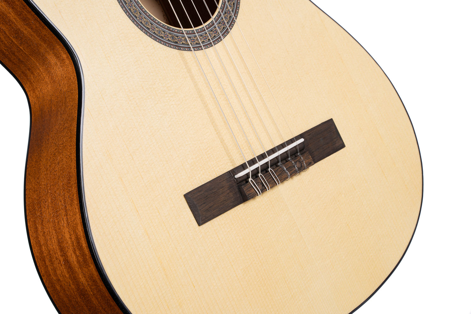 Ялина, використана для верхньої деки, поєднує в собі гнучкість та міцність, що робить її ідеальним матеріалом для акустичних гітар. Чудова тембральна якість робить ялину популярним вибором для різних музичних стилів.