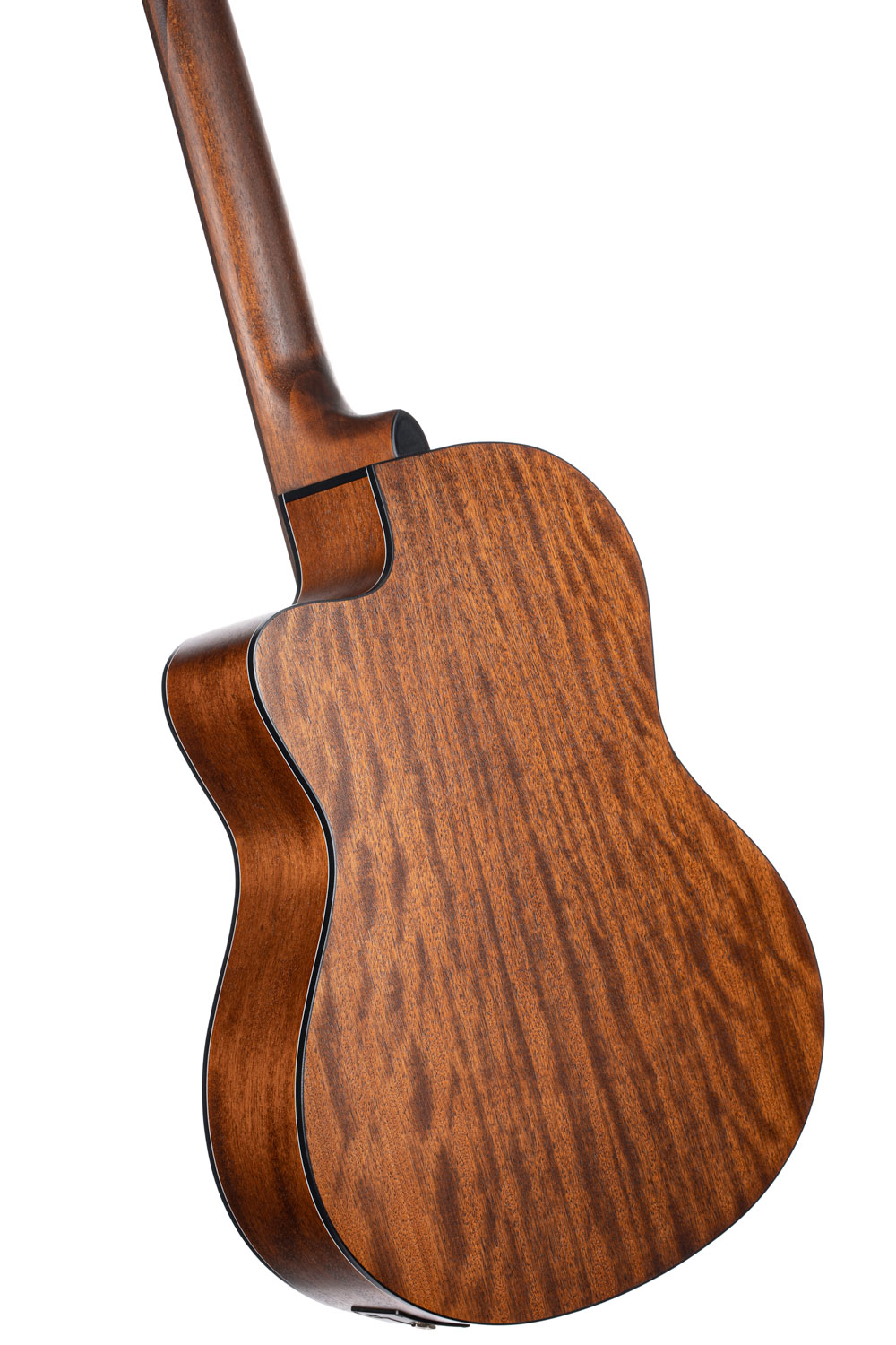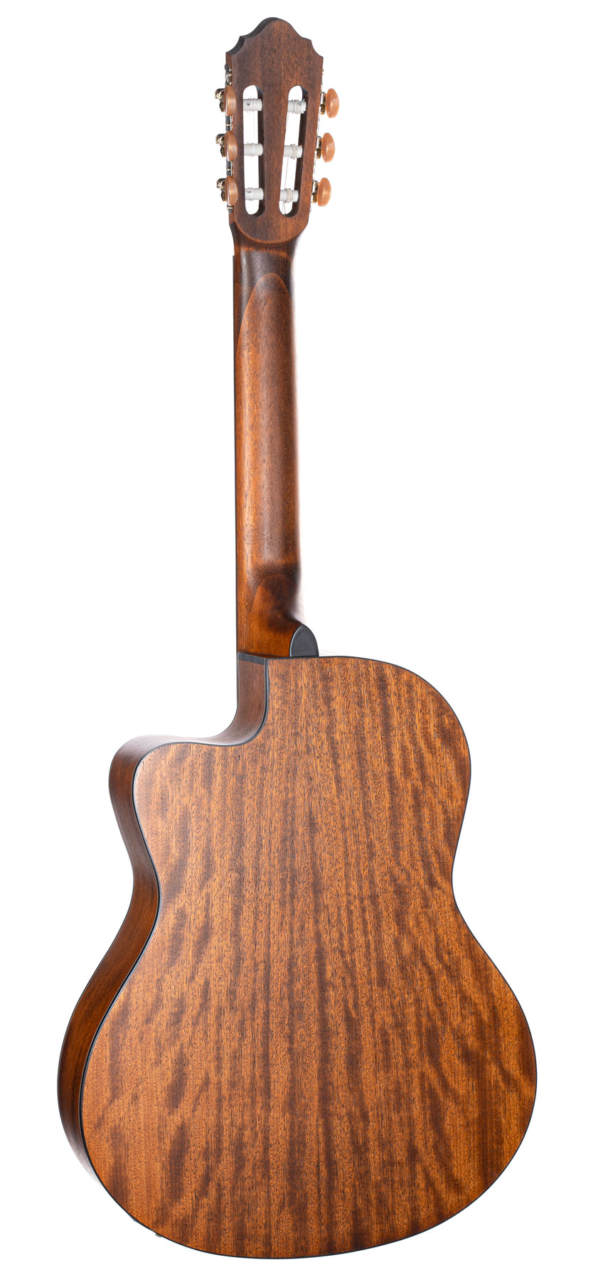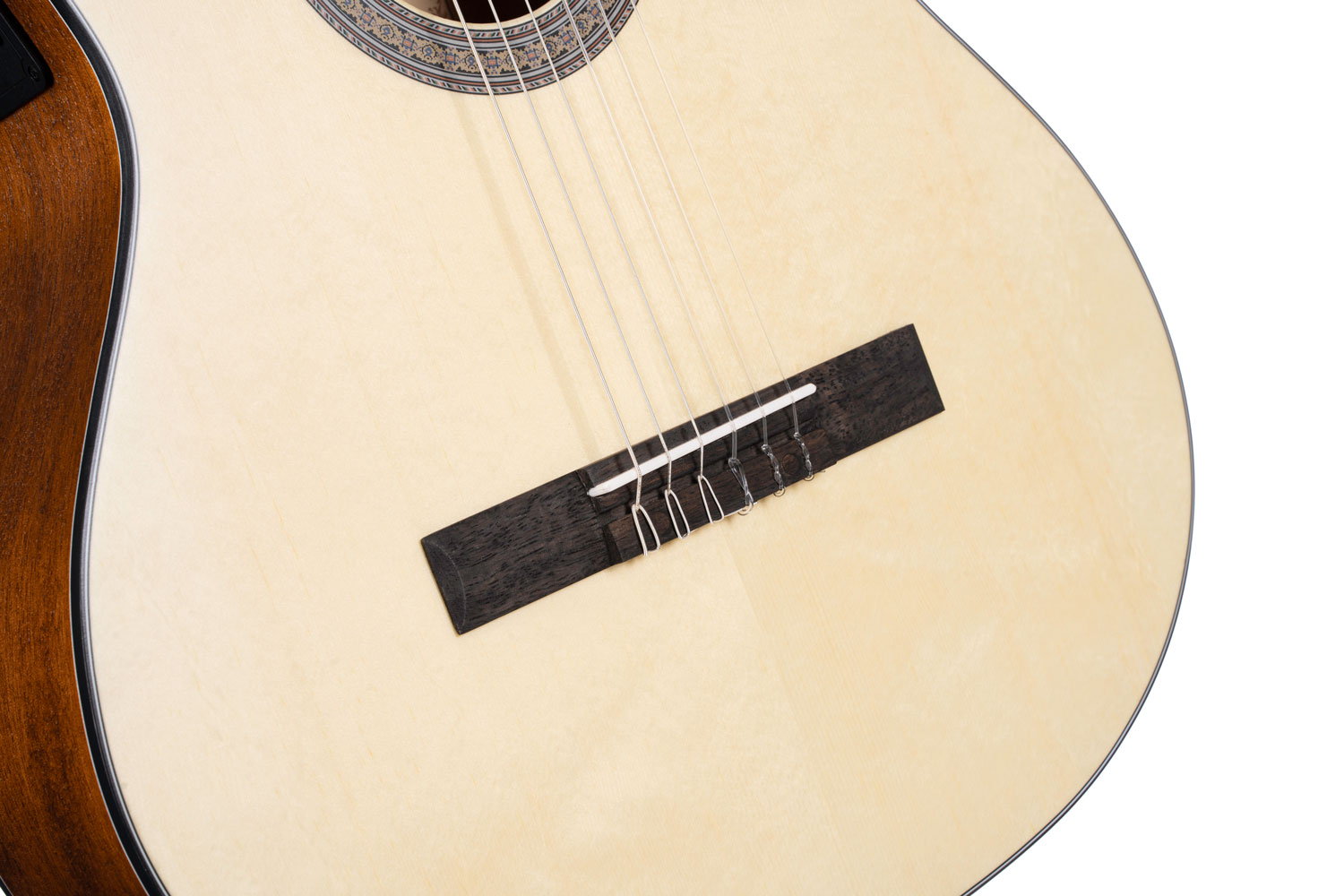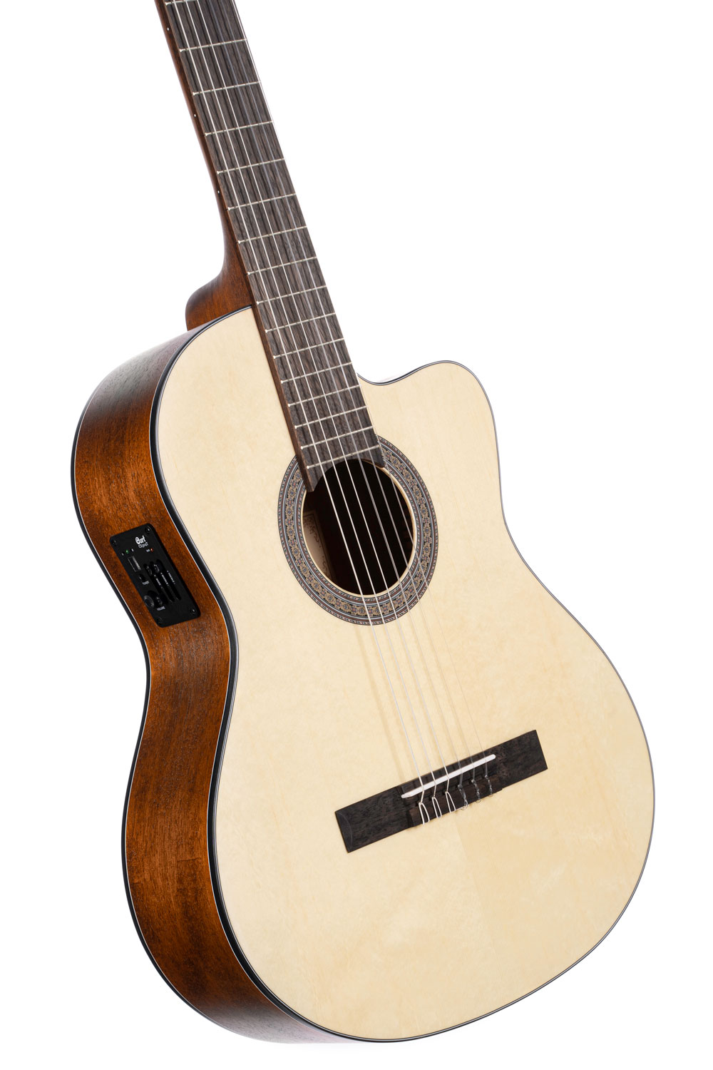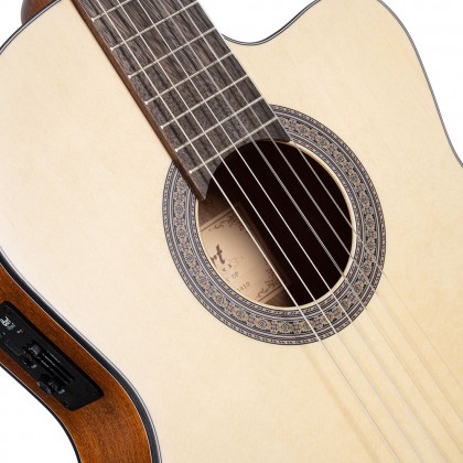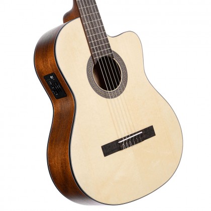 AC120CE - це недорога класична гітара з зручним вирізом для доступу до верхніх ладів і фірмовим звукознімачем Cort з 3-смуговим еквалайзером і вбудованим хроматичним тюнером. Це ідеальний вибір як перша електрокласична гітара для виступів на сцені.