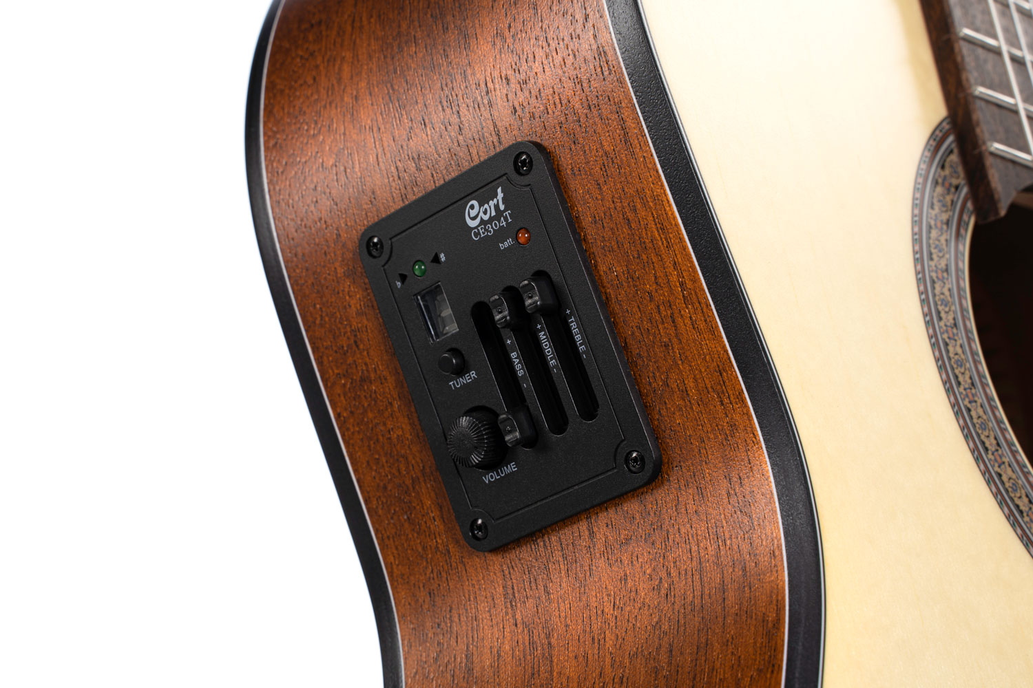 AC120CE обладнана вбудованим керамічним п'єзозвукознімачем і преампом Cort CE304T. 3-смуговий еквалайзер дозволяє точно налаштувати звучання інструменту, а хроматичний тюнер з LED-дисплеєм дає можливість швидко і зручно налаштувати гітару навіть на темній сцені.
