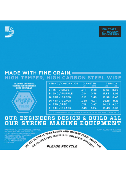 Шестигранні сердечники і перші три струни D'Addario серії EXP тепер виготовлені з високовуглецевої сталі NY High Carbon Steel. Завдяки впровадженню нових методів виробництва, струни EXP стали суттєво міцнішими і помітно стабільніше тримають лад.