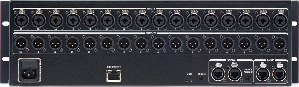 16-канальная патч-панель системы персонального мониторинга с интерфейсом BLU-Link Cat5, 16 аналоговых Combo входов, 16 аналоговых выходов XLR, частота дискретизации 48/96 кГц.