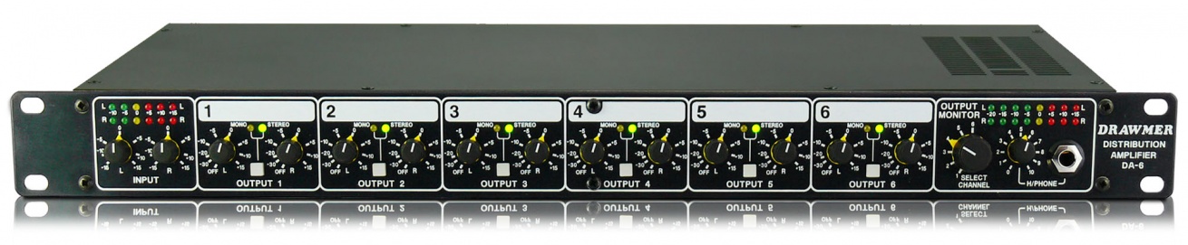 Drawmer DA-6 представляет собой шестиканальный стереофонический (или двенадцатиканальный монофонический) усилитель-распределитель, имеющий симметричные входы и выходы на разъемах типа XLR с дополнительными симметричными трансформаторами. Питание на удаленные усилители и записывающие устройства подается от отдельных источников.