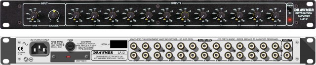 Drawmer LA 12 - представляет собой малошумящий усилитель-распределитель с низким уровнем взаимопроникновением каналов. Усилитель обладает широким частотным диапазоном, разработанной специально для копирования кассет в режиме реального времени. LA 12 представляет собой эффективное решение сопряжения большого количества кассетных дек в режиме реального времени. Прибор LA 12 предназначен для установки в стандартную 19-дюймовую стойку для оборудования и занимает в стойке одно стандартное место (1U). Дополнительный стереофонический выход, сигнал на который подается после регулятора уровня усиления и регулятора баланса, может быть соединен с входом второго усилителя LA 12, что позволяет иметь большее количество стереофонических выходов.