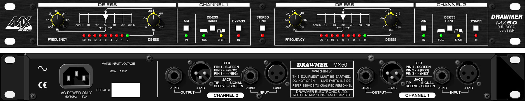 MX50 – профессиональный гибкий в использовании, простой в установке и настройке 2-х канальный де-ессер, предназначенный для удовлетворения требований звукорежиссеров нужд инсталяций, студий звукозаписи, радиовещания, театров и студий звукозаписи. Предназначенный для решения проблем, связанных с шипящими и свистящими звуками ("С", "Ч", "Ш" и т. п.). Прибор также может использоваться для сглаживания стереофонических фонограмм, для снижения шума струн акустических гитар и шума дыхания при игре на флейте и даже для повышения качества звучания тарелок и барабанов. Необходимая обработка звуковых сигналов достигается путем регулировки всего лишь двух управляющих параметров: частоты и величины ослабления. Регулятор частоты работает в диапазоне от 800 Гц до 8 кГц, охватывая полный диапазон свистящих и шипящих звуков, включая тяжело звучащие гармоники и другие мешающие эффекты, которые могут возникать при усилении высоких частот. Затем следует переменный де-ессинг, который можно считать дополнительным регулятором: он позволяет добиться ослабления до 20 дБ на выбранной частоте.