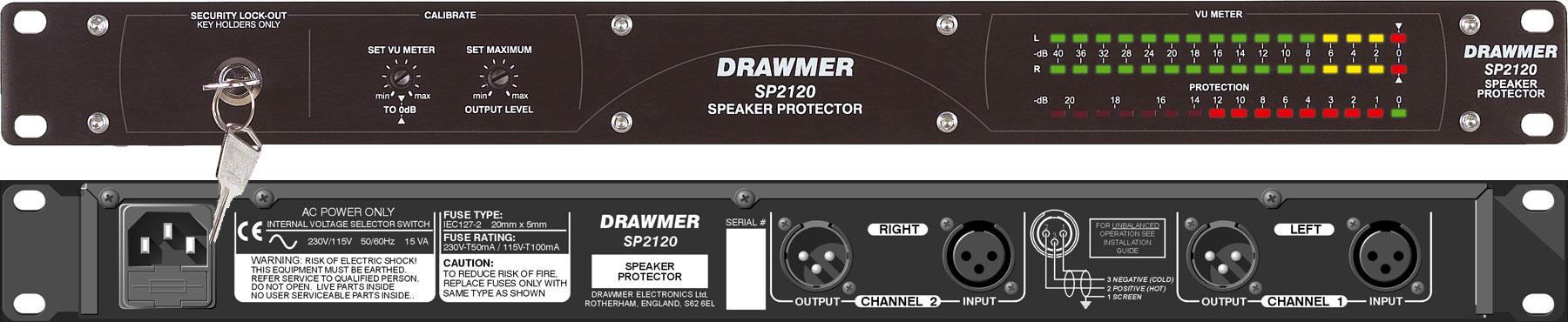 Передняя панель устройства имеет встроенный замок, который гарантирует, что доступ к настройке максимального уровня громкости будет иметь только тот, у кого есть ключ. Когда замок открыт, пользователь имеет доступ к двум регуляторам на передней панели, с помощью которых можно осуществить все необходимые настройки. Первый регулятор позволяет откалибровать по 16-сегментным электронным индикаторам уровни левого и правого каналов в соответствии с входным сигналом, и указать необходимый уровень, когда должна включиться защита. Второй регулятор отвечает за уровень громкости, который может развить звуковоспроизводящая система. При поступлении на SP2120 сигнала с повышенным уровнем, активируется схема защиты, которая поддерживает указанный уровень громкости системы без ухудшения качества звучания. В SP2120 используется весь 25-летний опыт компании Drawmer. Тракт звукопередачи сигнала этого устройства объединяет в себе схему multiple time constant (многократная временная константа) и автоматическую регулировку уровня усиления (AGC), что позволяет небольшим перегрузкам звучать громче.