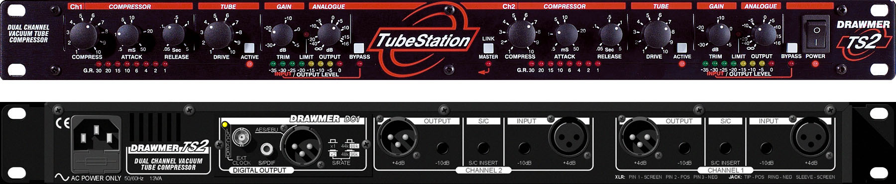 Drawmer Tube Station 2 (TS 2) представляет собой двухканальный моно или стерео ламповый компрессор, работающий в режиме Soft-Knee. Регулировка всех параметров осуществляется независимо для каждого канала. Для настройки лампового насыщения на выходе предусмотрен регулятор Drive. Аппарат имеет вход Side Chain и фиксированный пороговый лимитер.