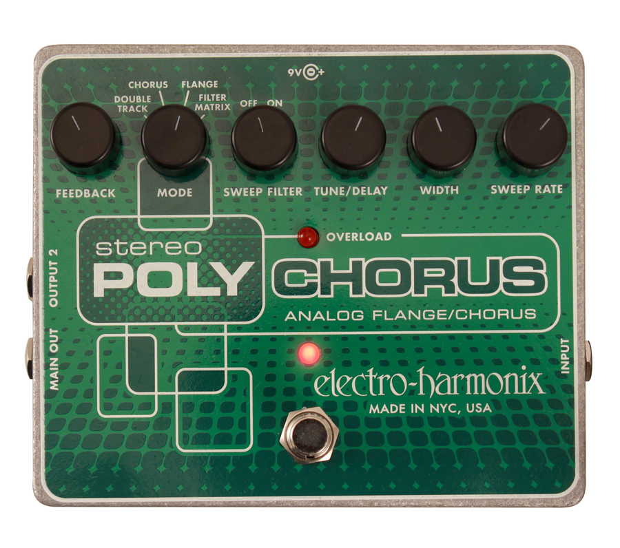 Electro-Harmonix Stereo Polychorus – легендарный Polychorus, но теперь работающий в стереорежиме и имеющий улучшенный коэффициент соотношения сигнала/шума. Оригинальный же Polychorus известен как кузница многих известных хорус-тонов, которые можно услышать в песнях таких групп, как Nirvana и King Crimson эры 80-х. Педаль предоставляет четыре самодостаточных режима: Filter Matrix, Flange, Chorus, Double Track (короткое эхо). Эти режимы в сочетании с пятью ручками управления и переключателем Sweep Filter, активирующим дополнительный фильтр с эффектом модуляции, позволяют создать просто запредельный звук.