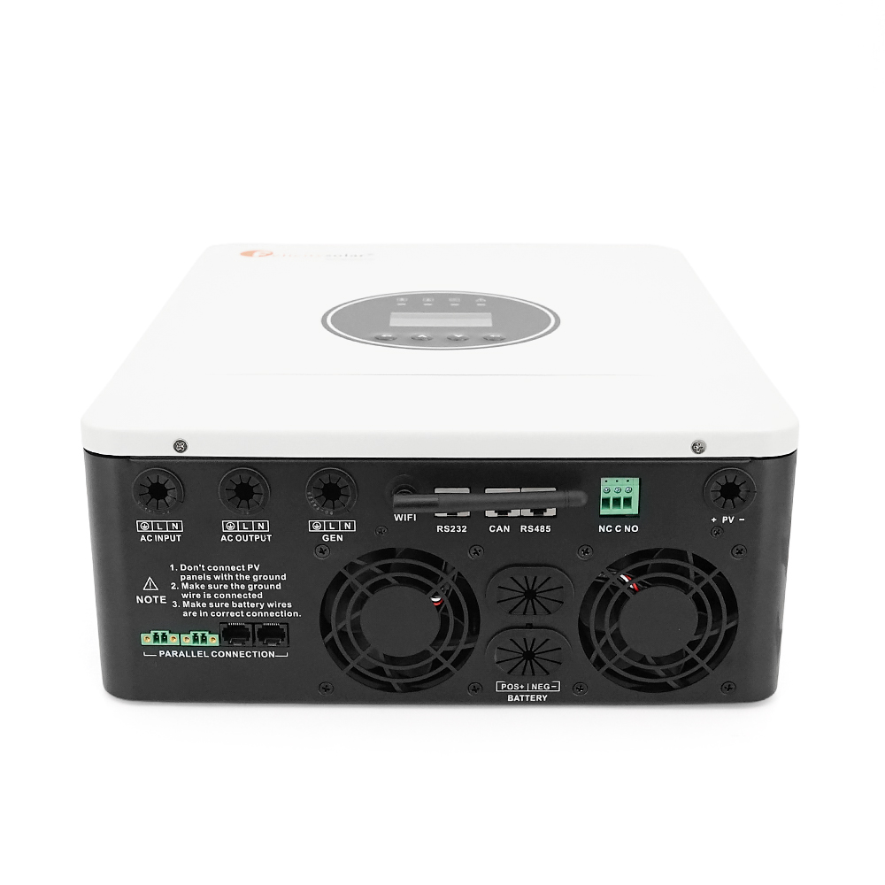 - Підтримка різних типів батарей: AGM, Flooded, Self-defined, а також літієвих (LiFePO4) з можливістю зв`язку за протоколом BMS (відображення SOC та параметрів на дисплеї).