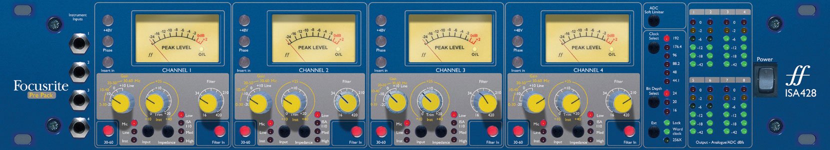 ISA 428 PREPACK 4-канальный микрофонный предусилитель, микрофонный вход на каждом канале, симметричный линейный и несимметричный инструментальный входы, симметричный посыл-возврат, стрелочный индикатор пикового уровня со встроенным светодиодным