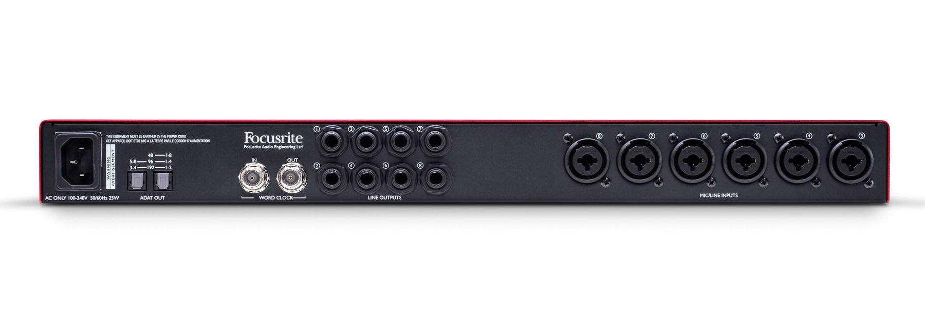 8-канальный предусилитель, АЦП 24 бит/192 кГц, преампы Scarlett 2-го поколения, интерфейс ADAT, Mic/Line/Hi-Z instr входы, Word Clock, аттенюатор +8 дБ, 5-сегментные индикаторы уровня