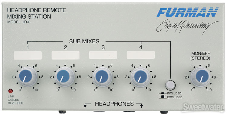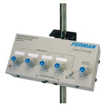 Furman HR 6 - персональный микшер для наушников имеет регуляторы уровня четырех моно и одного стерео каналов, встроенный усилитель для наушников с двумя выходами (мощность 500 мВт на 100 Ом) и кнопку отключения моно источников. HR 6 можно установить на микрофонную стойку.