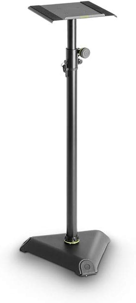 Стійка для студійного моніторів, регулювання висоти 900 – 1500 мм, основа: чавун, змінні кільця: 1x15 мм/1x20 мм/1x30 мм, платформа: 250х250 мм, нахил до 10°, вантажопідйомність (без шипів): 30 кг, вага 7 кг.