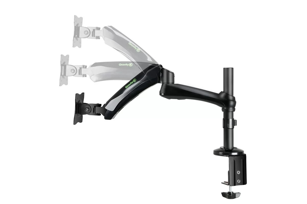 VESA кронштейн для монітора 13”–27”, стандарт 100х100/75х75 мм, навантаження до 9 кг, нахил: -90°/+ 90°, поворот: 180°, обертання: 360°, довжина винесення: 527 мм, вага: 3.85 кг.