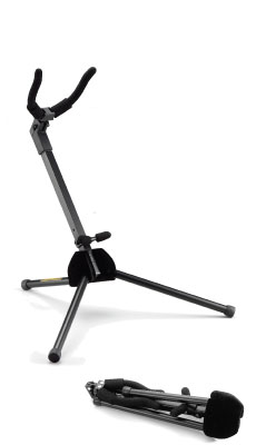 Компактная складывающаяся стойка для альт/тенор саксофона, система автофиксации, покрытие: мягкий пеноматериал, высота: 430 мм, сложенный: 310x110 мм, допустимая нагрузка 10 кг, вес 1 кг + чехол.
