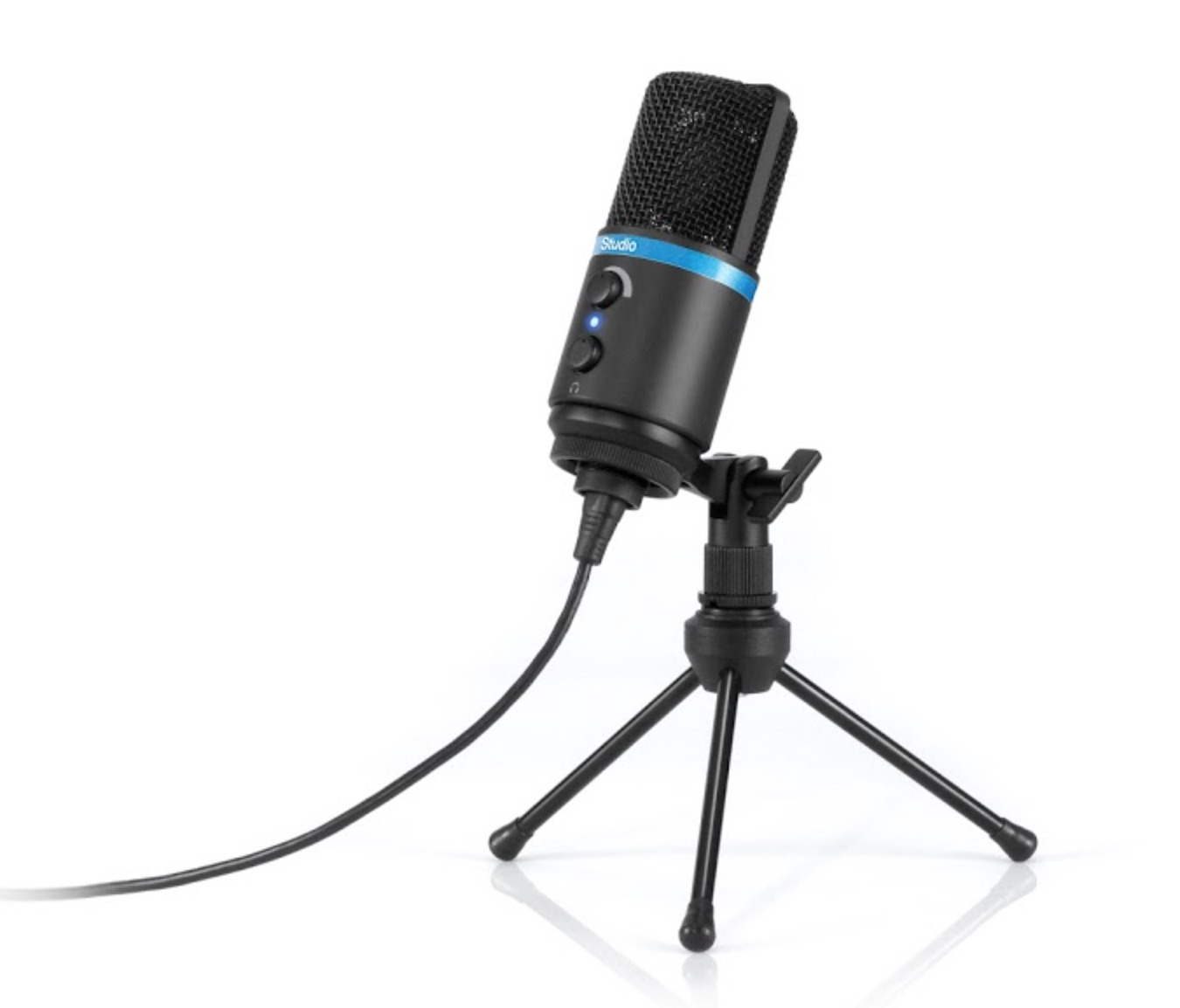 Конденсаторный USB-микрофон с большой диафрагмой для Android/iOS, АЦП/ЦАП 24-бит/48 кГц, питание по Micro USB, регуляторы предусиления и наушников, 3.5 мм выход, iOS/OTG кабели и стойка в комплекте.