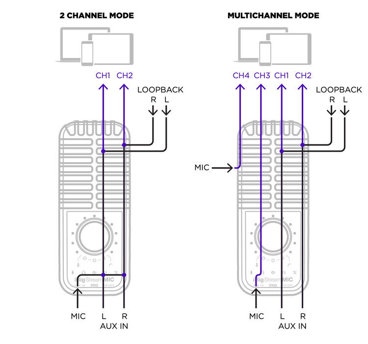 iRig Stream Mic Pro предлагает 2 режима: стерео или многоканальный. По умолчанию аудиоинтерфейс работает в стереорежиме и предварительно микширует несколько источников звука (линейные стереовходы, Loopback и микрофонные капсюли) в стереодорожку с маршрутизацией в выбранное приложение для трансляции, такие как Instagram, Facebook, Twitch, и т.д.