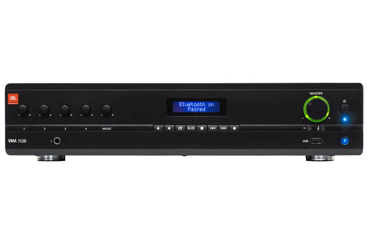 JBL VMA1120 оснащен МР3-плеером с USB-портом и поддержкой Bluetooth. Он может работать при низкоомной нагрузке — 4 или 8 Ом, на линии 70/100 В. Для регулировки звучания есть независимые регуляторы низких и высоких частот для каждого выходного канала. Реализована возможность работы с настенными контроллерами JBL CSR-V.