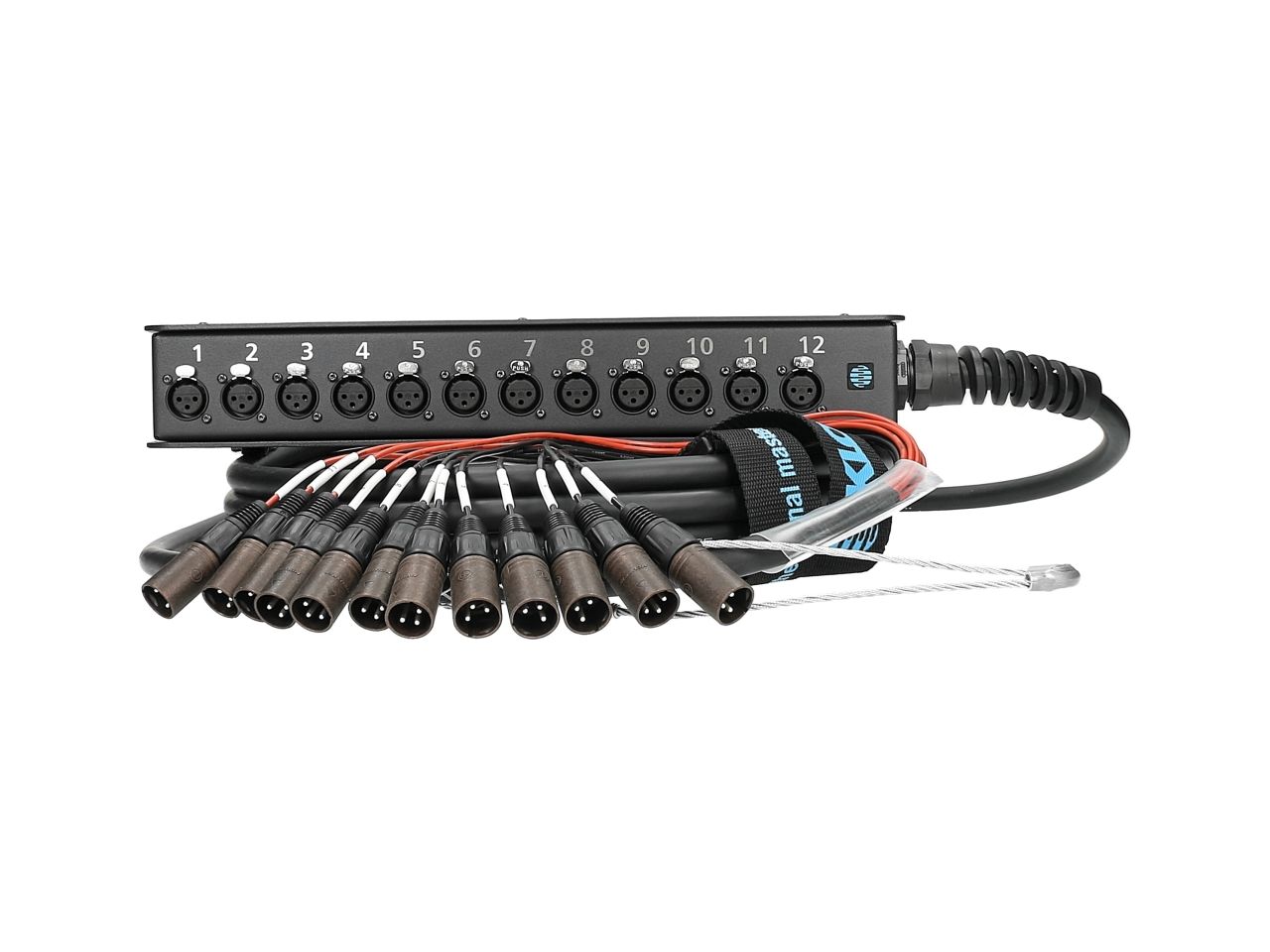 12 канальный мультикор/стейджбокс, конфигурация 12/0, 12 входов XLR "папа" NC3MX-B - 12 панельных XLR "мама", кабель: PW12-X, алюминиевый корпус, размеры: 384x61x64,5 мм.