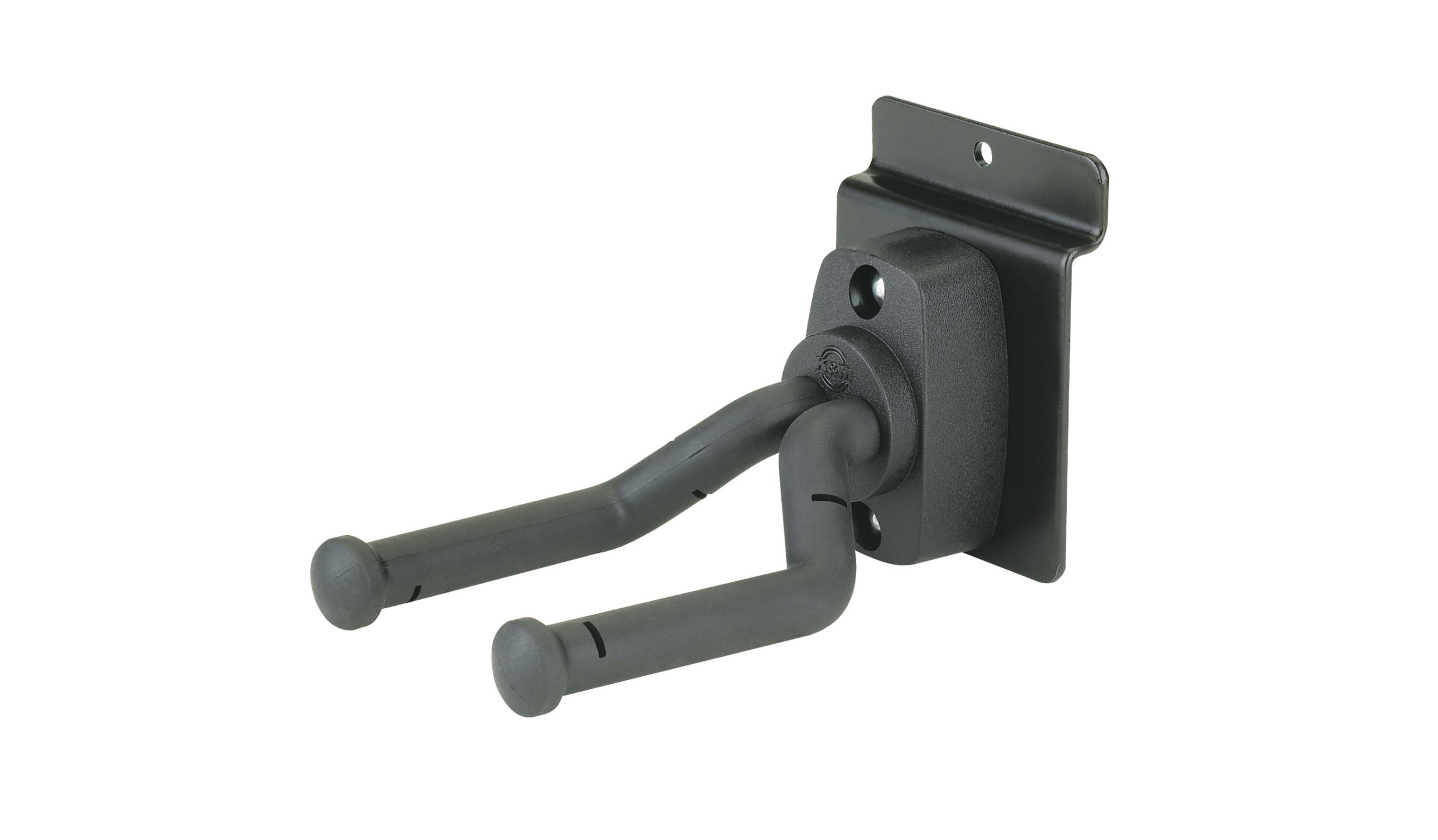 Стальной держатель для акустических и электрогитар, габариты 88x93x140 мм, покрытие: мягка резина, самофиксация грифа.
