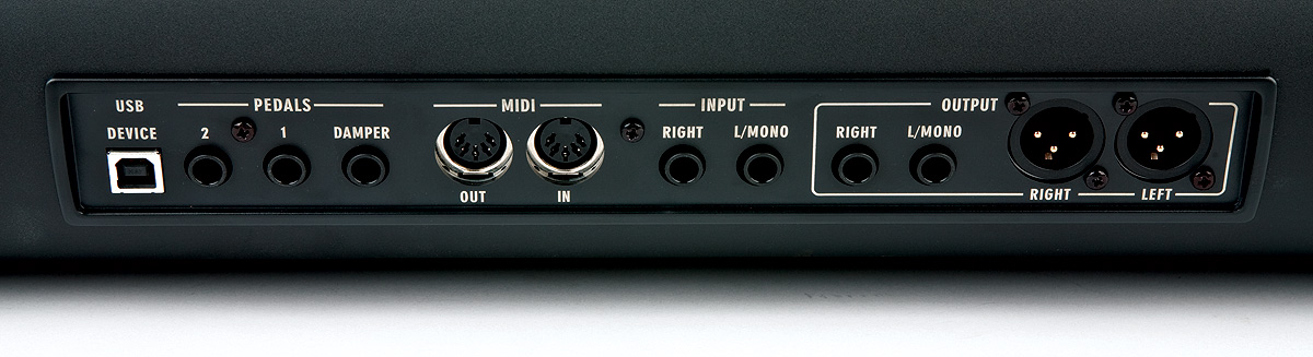 Ни один профессиональный клавишный инструмент не будет полноценен без необходимого набора подключений. SV-1 оснащен сбалансированными XLR и ¼-дюймовыми выходами, аудиовходами для левого и правого каналов, входом и выходом MIDI, USB MIDI портом и тремя разъемами для подключения педалей: демпфирующая педаль, педаль 1 и педаль 2. В комплект поставки входит демпфирующая педаль с половинным нажатием, что приближает ее работу к педали настоящего рояля. Разъем «Pedal 1» рассчитан на работу с педалью-переключателем, которая может использоваться в качестве педали состенуто или в качестве переключения скорости при включенном эффекте лесли. К разъему «Pedal 2» можно подключить регулируемую педаль (для управления эффектом вау-вау или точного контроля громкости органного звука) или дополнительную кнопочную педаль, что позволяет добавить заглушающую педаль и предоставляет самому требовательному пианисту все три педали, как на настоящем рояле.
