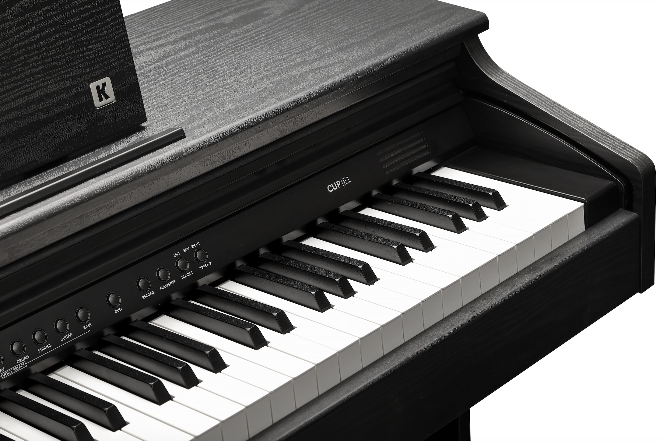 Цифровое пианино CUP E1. 88 клавиш с полновзвешенной молоточной механикой и 4 уровнями чувствительности клавиш (H1 Ivory). LCD дисплей, звуковая библиотека KORE 1.0 (128MB), полифония 128 голосов, 16 программ (звуков), функциональность разделения и наслоения тембров, транспонирование, эффекты: Reverb, Chorus, EQ, рекордер на 2 трека, 2 песни, акустическая система 40 Вт BT 5.0 Audio Reception, 3 стандартных рояльных педали, комплектация: DC блок питания, держатель для наушников, банкетка. Цвет: черный матовый, размеры: 84.5 х 138.5 х 44.1 см, вес: 49.58 Кг.