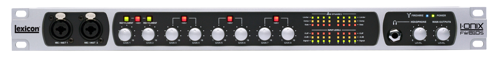Lexicon® I•ONIX FW810S обладает богатым набором возможностей: микрофонные предусилители dbx с дополнительным питанием и с пониженным уровнем собственного шума, реверберация Pantheon II и мощный программный микшер с динамическими обработками от фирмы dbx и аппаратной реверберацией. Это больше, чем FireWireT™ аудио интерфейс с 8 входами и 10 выходами. Это профессиональная студия звукозаписи, размером в один рэковый юнит.