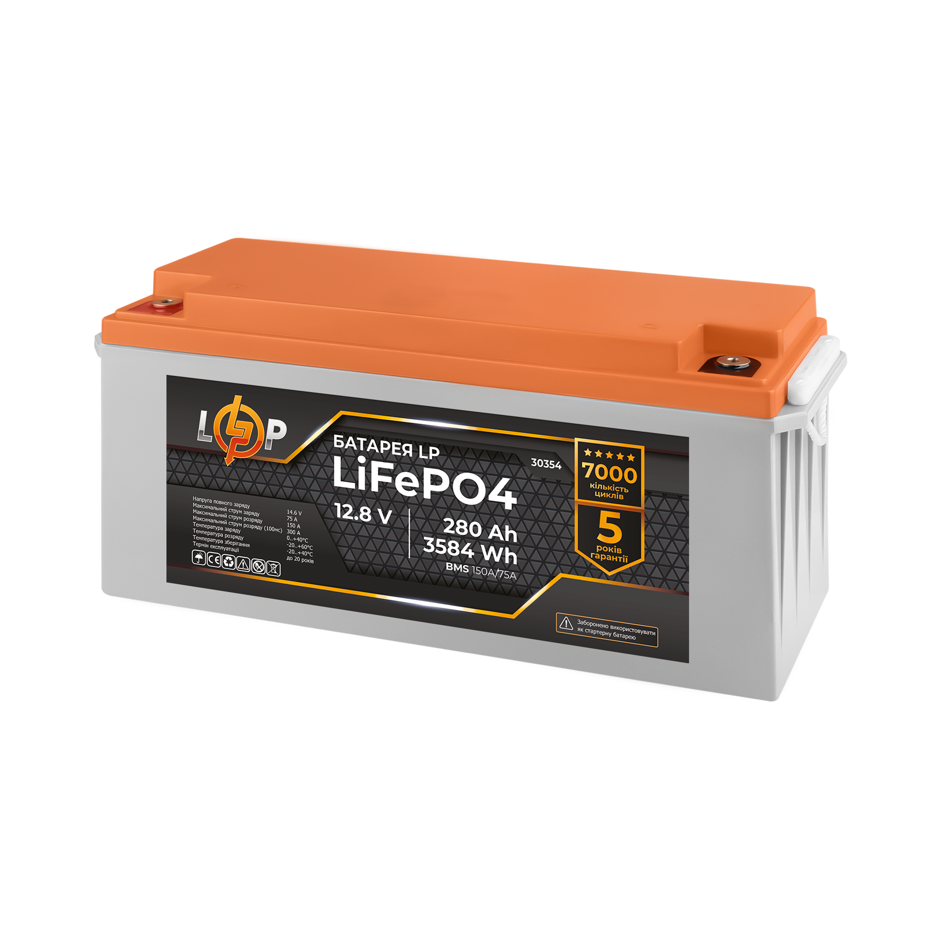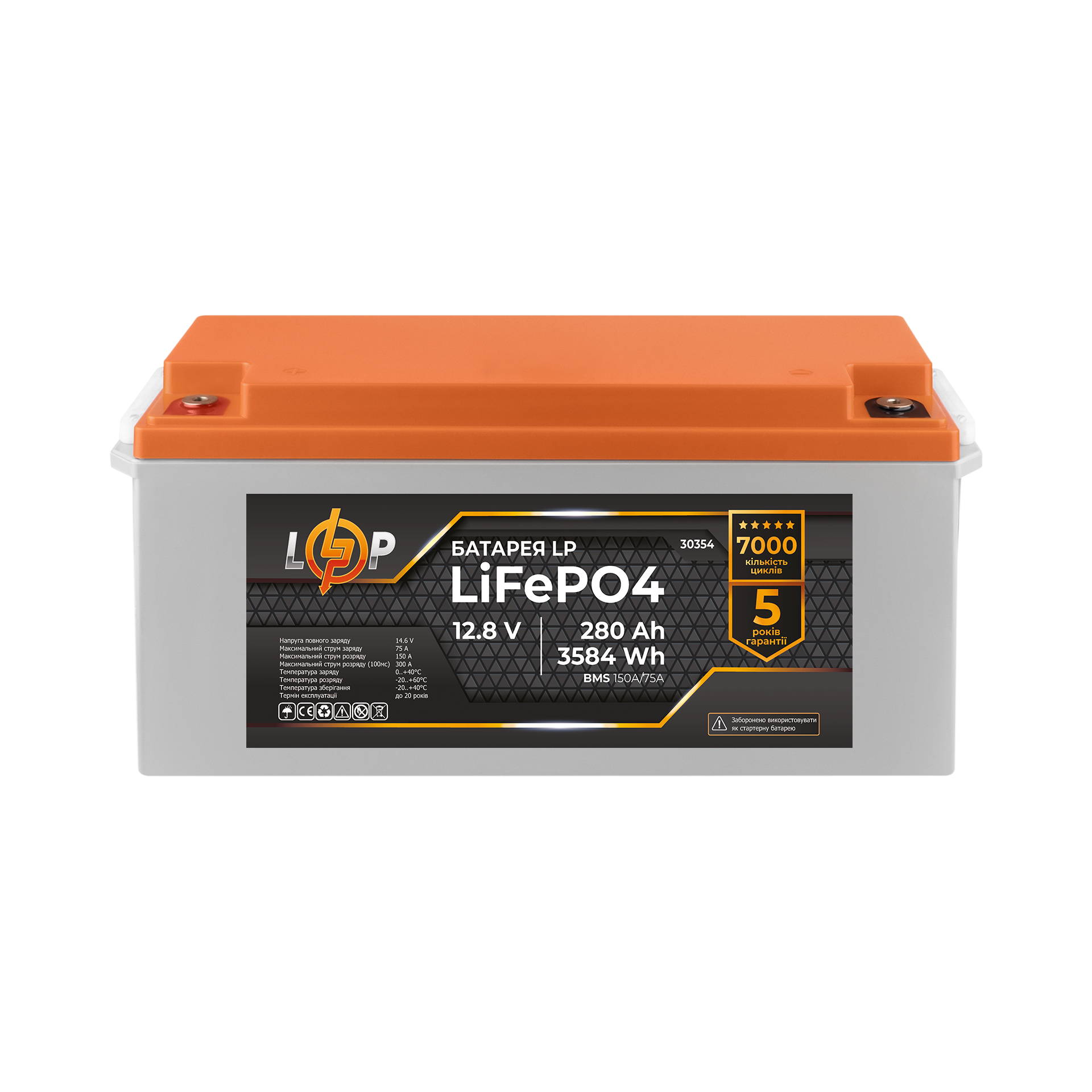 Акумулятор LP 12,8V - 280 Ah (3584Wh) (BMS 150A/75А) пластик заборонено використовувати як стартерний АКБ в автомобілях! Не рекомендовано під'єднувати до ДБЖ!