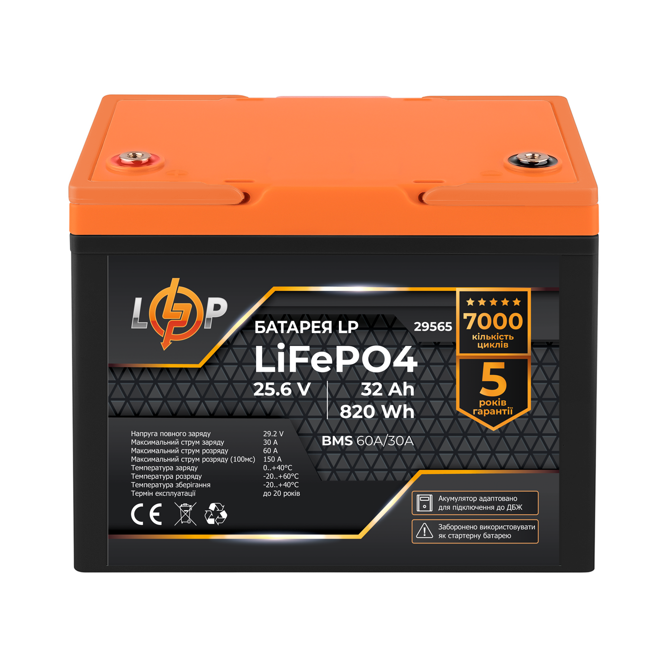 Акумулятор LogicPower LP LiFePO4 25,6V - 32 Ah (820Wh) (BMS 60А/30A) пластик для ДБЖ