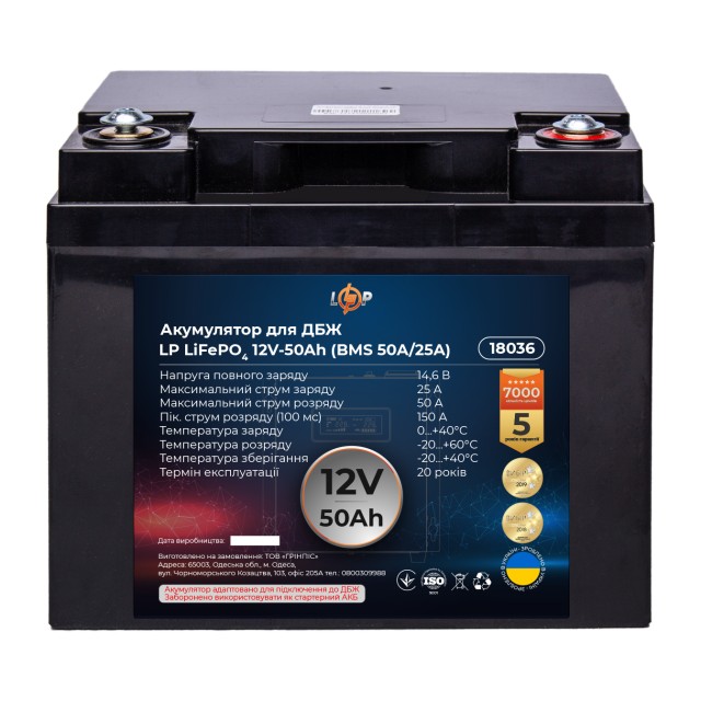 Акумулятор LogicPower LP LiFePO4 для ДБЖ 12V (12,8V) - 50 Ah (640Wh) (BMS 50A/25A) пластик