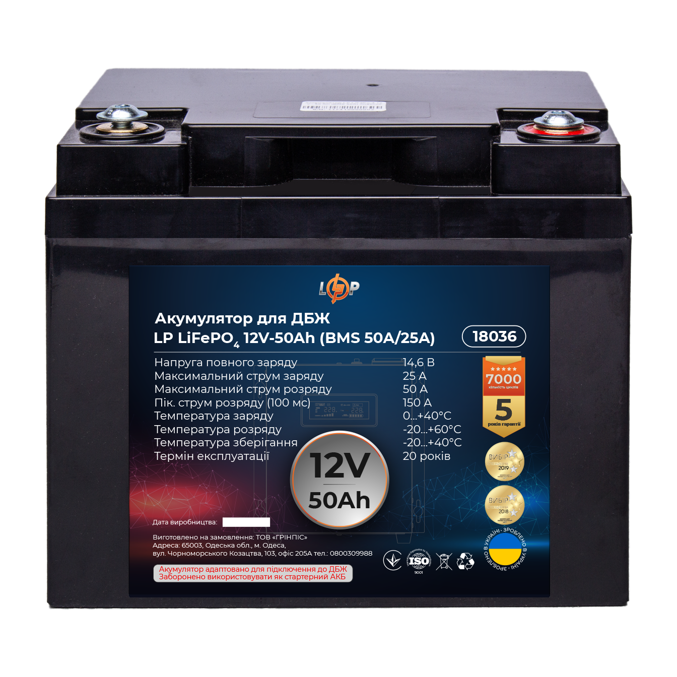 УВАГА! Акумулятор 12V - 50 Ah (BMS 50A/25A) пластик для ИБП заборонено використовувати як стартерний АКБ в автомобілях та інших транспортних засобах!