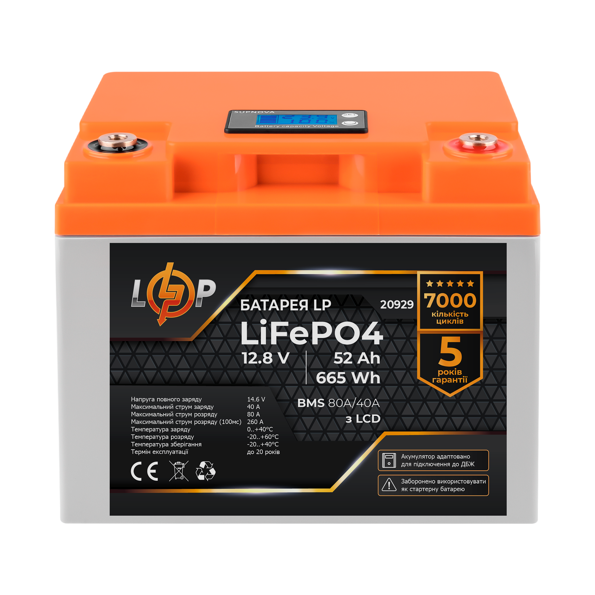 УВАГА! Акумулятор 12,8V - 52 Ah (665Wh) (BMS 80A/40А) пластик для ИБП с LCD заборонено використовувати як стартерний АКБ в автомобілях та інших транспортних засобах!