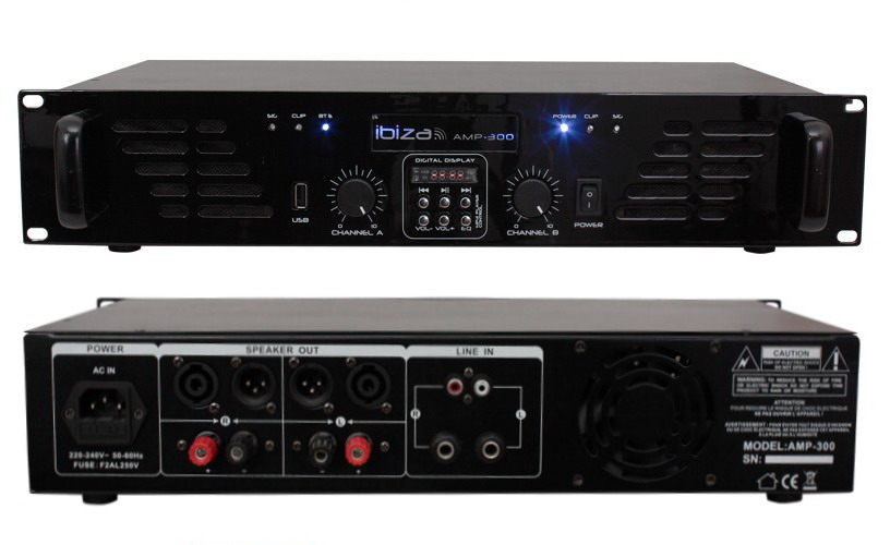 2-канальный усилитель, мощность 2x240 Вт (4 Ом)/2 x 160 Вт (8 Ом), АЧХ 20 Гц - 20 кГц, 2 входа (Jack), 2 входа (RCA), USB плеер, модуль BLUETOOTH, ЖК дисплей, активная система охлаждения.