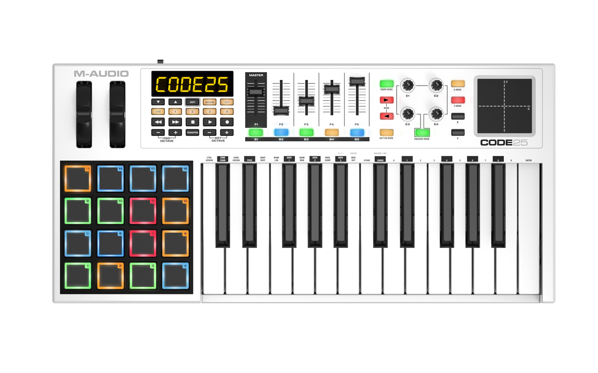 25-нотный USB MIDI-контроллер с чувствительной к скорости нажатия клавиатурой,функция aftertouch, транспонирование и октавный сдвиг, 16 пэдов, 4 энкодера, 5 фейдеров, X/Y тачконтроллер.